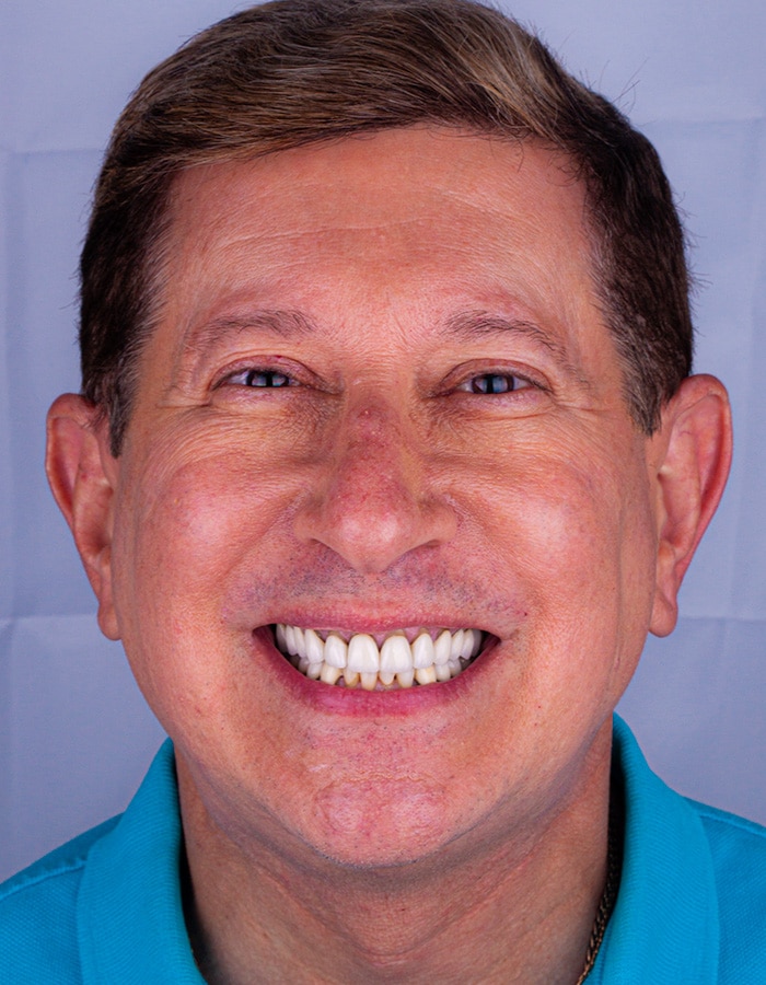 Seeking a bright, white smile to renew old porcelain fused to metal crowns, this patient underwent a full mouth reconstruction with crowns on every tooth. The dark lines from his old crowns were replaced with a bright, white smile that matches in color.